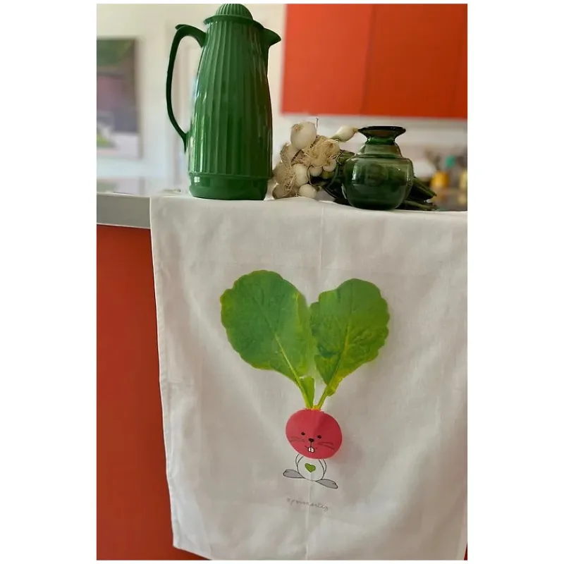 Le torchon Radis craquant est doté d’une patte d’accroche en coton blanc, très pratique pour le suspendre à un support.