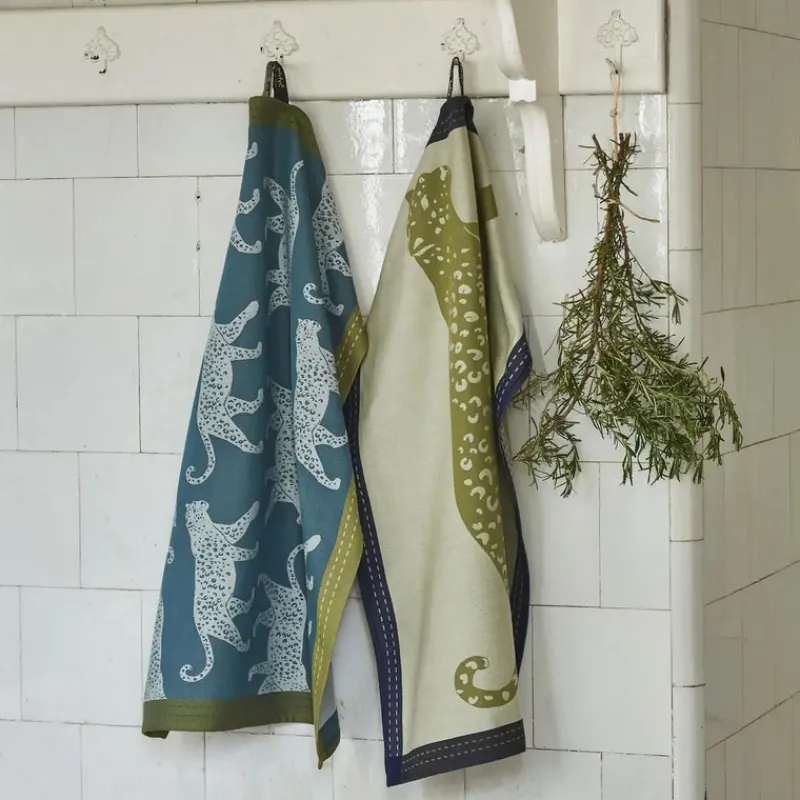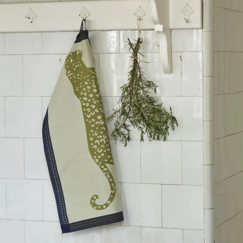 Le torchon Léo de Sylvie Thiriez est confectionné en tissu jacquard. Animez votre cuisine de ce joli léopard sublimé par une bordure Marine.