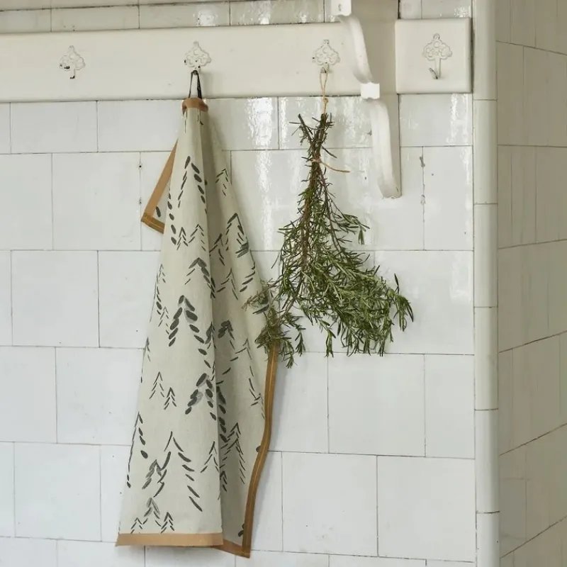 Une forêt de sapins se dessine sur le torchon Jacquard Spitzberg de Sylvie Thiriez. Encadré d’une jolie couleur beige, ce décor animera votre cuisine. Avec sa patte d’accroche, le torchon Spitzberg se suspend partout où vous en avez besoin. Tablier, crochet de cuisine, ou encore sur la porte du four.