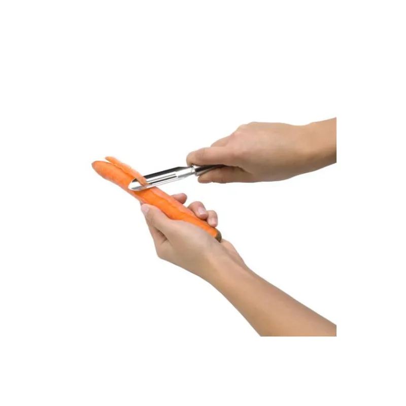 Sa lame tranchante convient également aux surfaces inégales et permet d’enlever rapidement et sans effort la peau des pommes de terre, des asperges, des concombres et de nombreux autres types de légumes. Le couteau éplucheur à légumes peut bien sûr être facilement nettoyé au lave-vaisselle et ensuite être accroché à un crochet à l’aide de la boucle pratique pour gagner de la place.