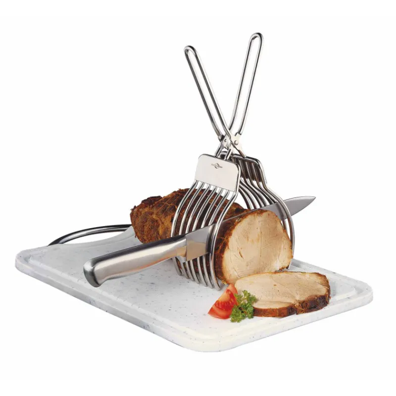 Cette pince coupe rôti permet de maintenir le rôti lors de la découpe et de réaliser ainsi facilement de belles tranches bien régulières. Vous coupez votre viande en toute sécurité et vous vous assurez un service impeccable.