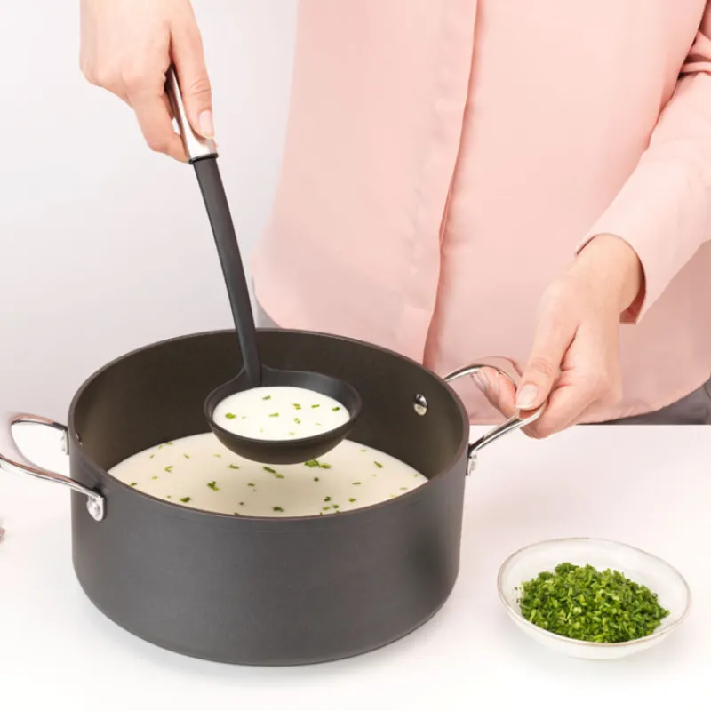 La louche à soupe Profile Brabantia avec son manche en acier inoxydable et sa louche en nylon, indispensable au quotidien!