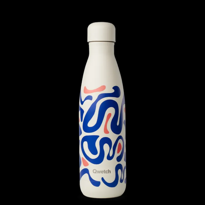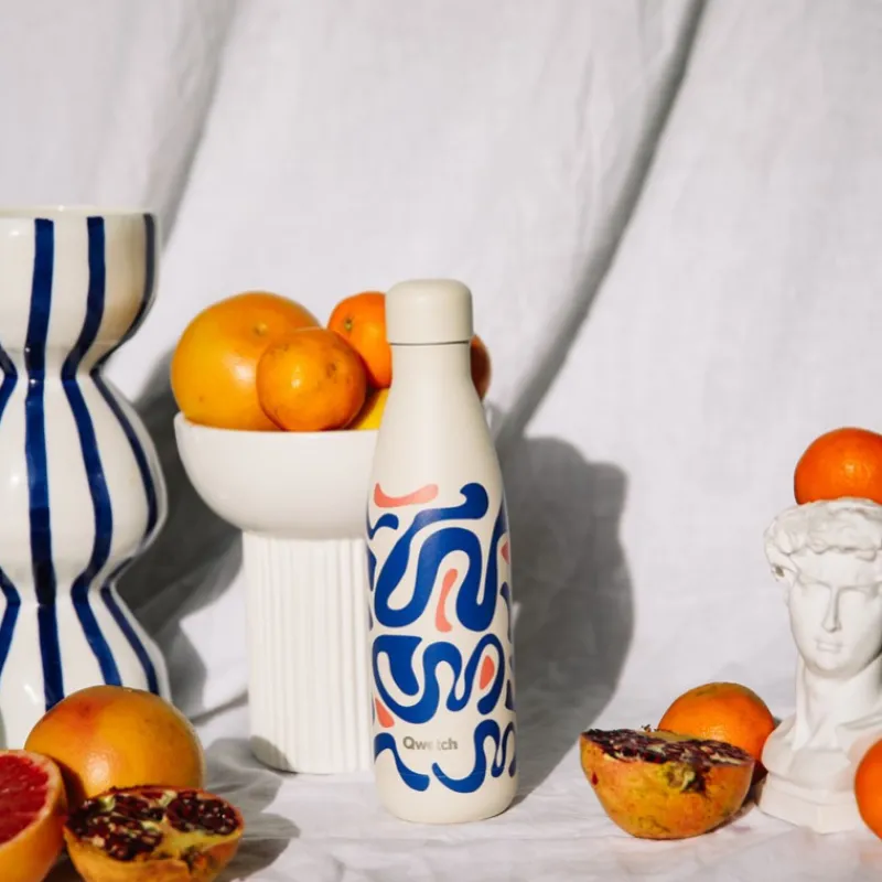 Découvrez la collection Summer pop de Qwetch, déclinée ici en Wave. Des bouteilles isothermes aux accents estivaux qui pourront transporter sans fuite vos boissons préférées, en les gardant au frais pendant 24h et au chaud durant 12h grâce à leur double paroi.
