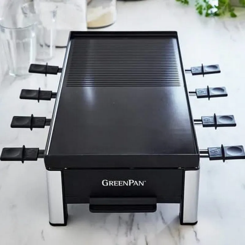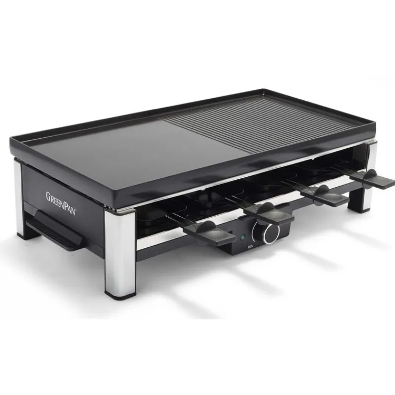 Le Gourmet GreenPan est composé d’une plaque en fonte d’aluminium réversible : un côté grill/teppanyaki et un côté pour réaliser des pancakes. Ajoutez à cela la fonctionnalité raclette pour 8 personnes et vous voilà en possession d’un appareil très complet !