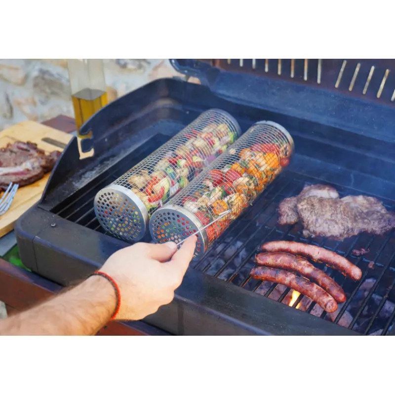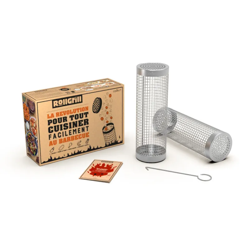 RollGrill, c’est le cylindre de cuisson pour cuire facilement sur la grille d’un barbecue classique tous les aliments de petites tailles. En plus des traditionnelles grillades et brochettes, avec le RollGrill, vous pouvez cuire facilement au barbecue vos accompagnements de légumes, pommes de terre mais aussi des viandes émincées ou des crustacés.
