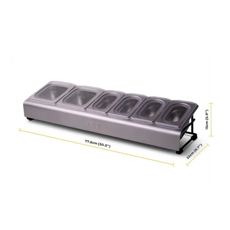 Avec ses deux bacs de 1,6 L et ses quatre bacs de 0,8 L, vous aurez toujours assez de garnitures pour préparer autant de pizzas que vous le souhaitez. Les couvercles transparents et sur mesure de chaque bac vous permettent de les empiler et les ranger facilement dans votre réfrigérateur. L’armature revêtue de poudre résistante aux intempéries et la coque en acier inoxydable sont quant à elles parfaitement adaptées aux tables modulaires Ooni.
