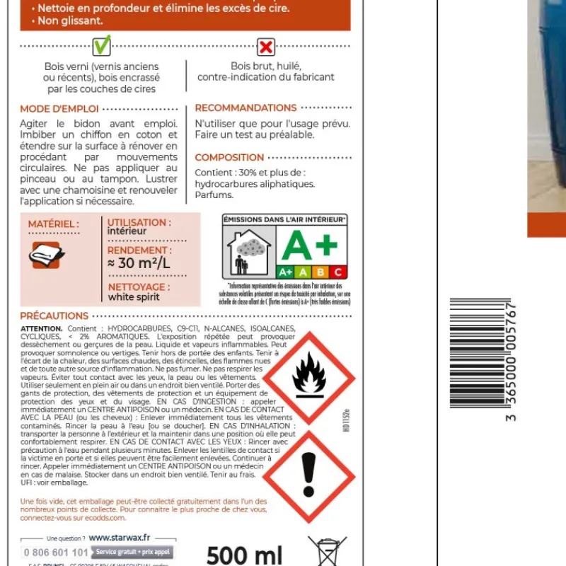 Le Rénovateur pour bois cirés et vernis de Starwax nettoie en profondeur et élimine les excès de cire sur les meubles et parquets. Il estompe les rayures, griffes de surface et les tâches en laissant un effet brillant.