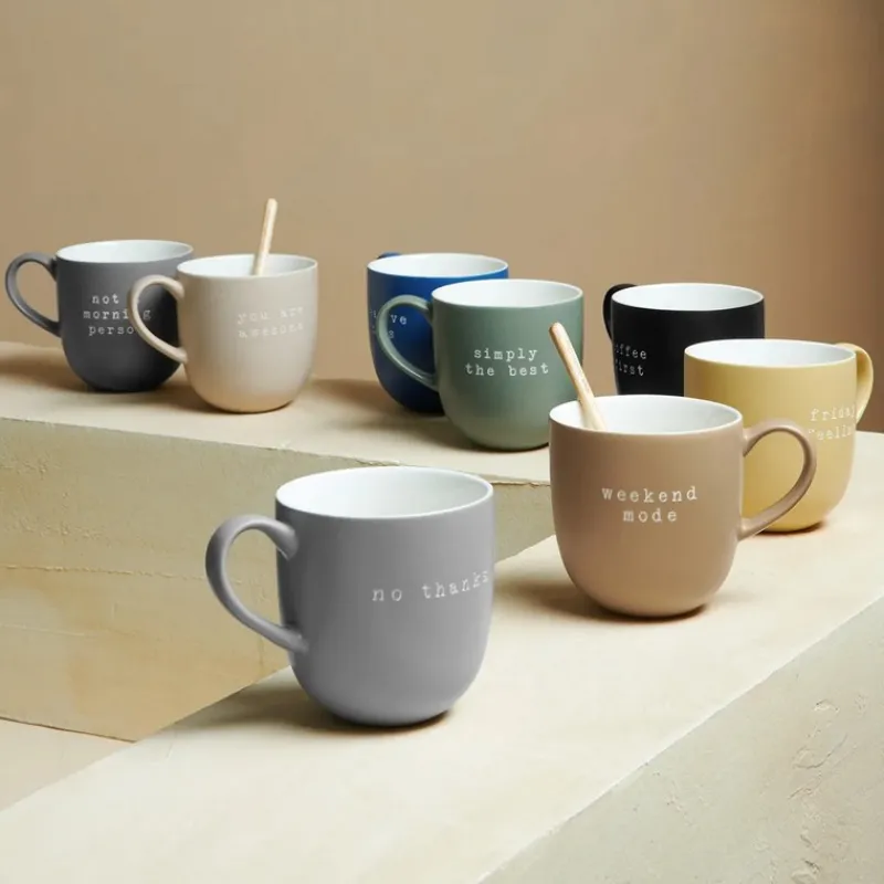 Les mugs Hey ! communiquent des messages sous la forme de déclarations sablées qui garantissent la bonne humeur : you are awesome, weekend mode, not a morning person, friday feeling, coffee first, creative chaos, no thanks et simply the best sont les huit messages au total, chacun élaboré par la technique du sablage à partir d’une couleur décorative différente.