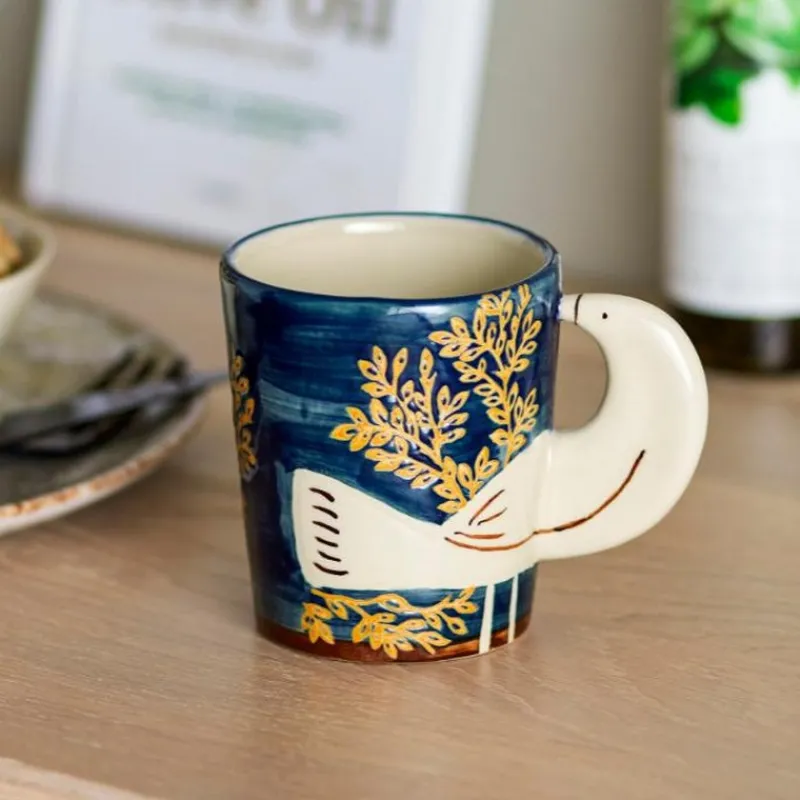 Cette tasse est conçue avec un motif d’oiseau en relief, qui sert d’anse pour porter la tasse. Grâce au fond bleu, les couleurs de l’oiseau ressortent particulièrement.