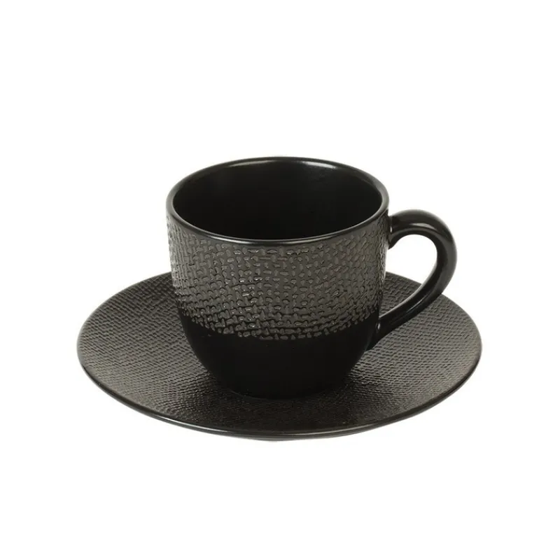 Appréciez le relief et la texture du grès sur cette tasse et sous-tasse noire de la collection Vésuvio. Pour une pause café toute en douceur, cette petite tasse de 12 cl est indispensable à la fin du repas.