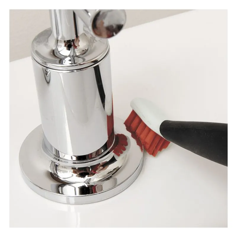 La grande brosse va récurer les joints de carrelage, les rails de douche, les dessus de cuisinière… pour éliminer les plus grosses tâches incrustées. La petite brosse accède aux petits recoins difficiles à nettoyer, où se loge le calcaire et toutes sortes de résidus. A son autre extrémité, utilisez l’embout racloir pour éliminer les saletés accumulées dans les petites fentes et les petits trous. Les poils à récurer sont très résistants et durables. Le manche antidérapant est très ergonomique, pour une prise en main agréable et un geste puissant. La grande brosse a une encoche pour poser le pouce et ainsi accompagner le geste durant le nettoyage.