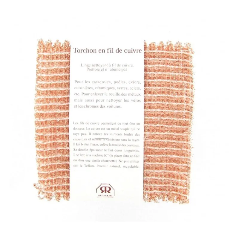 Le cuivre fait briller ce qui est fragile ! Le chiffon cuivre nettoie parfaitement et en douceur casseroles, poêles, éviers, les cuisinières, vitrocéramique, verre, inox, etc. Convient tout à fait pour nettoyer les couverts oxydés. Idéal également pour toutes les pièces polies de bicyclette et de moto ainsi que les vitres, les chromes et les jantes en alu de l’auto. De petits fils de cuivre arrachent la crasse la plus tenace en douceur – car le cuivre est un métal mou qui ne raye pas. Ne pas utiliser sur du téflon ou une matière semblable. Toujours utiliser avec beaucoup d‘eau !