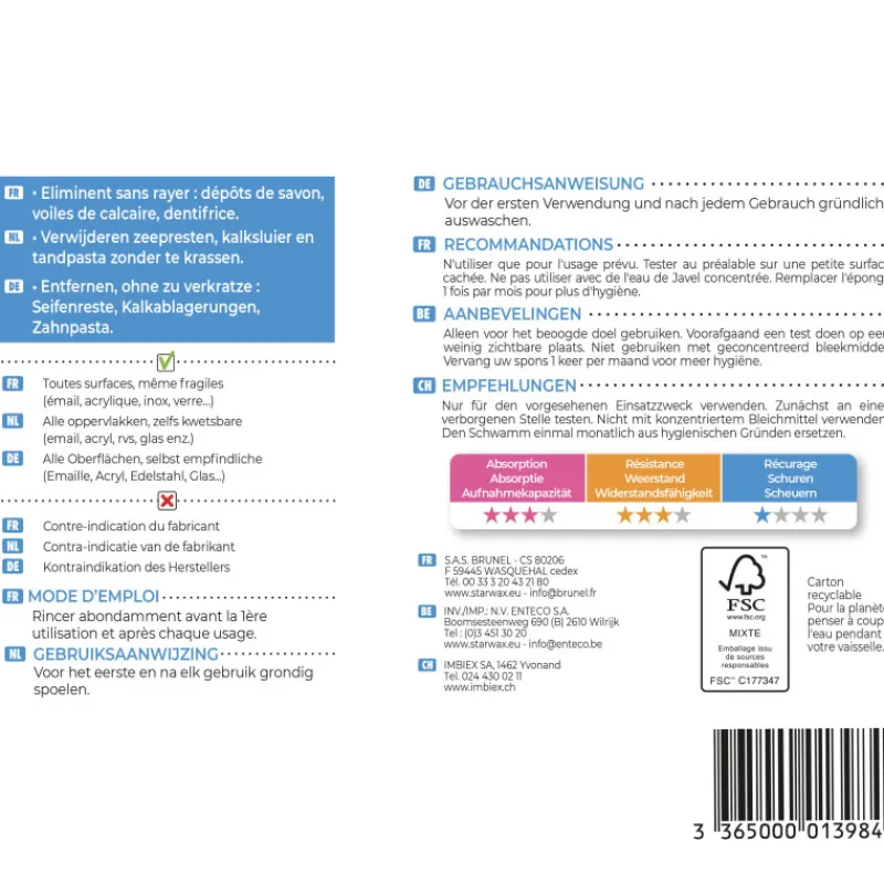 Ces éponges sont conçues avec une technologie de 3 couches, pour vous garantir une excellente efficacité. La première couche en fibre abrasives douces permet de décoller les salissures, la seconde fine couche en mousse hydrophile permet de maintenir l’éponge en bon état pour quelques utilisations. Enfin la dernière couche en fibres 100% végétales permet d’avoir une absorption maximale.