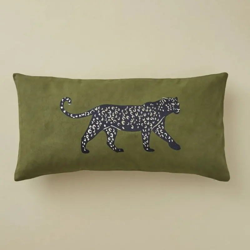Laissez cet élégant léopard participer à la décoration de votre intérieur ! Coussin rectangulaire Léo Kaki de Sylvie Thiriez.