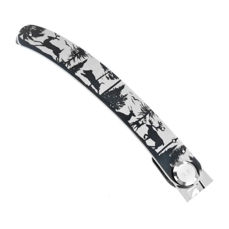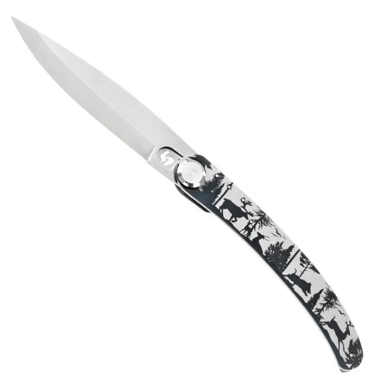 En promenade, en pique-nique, comme au quotidien, le décor Forêt se décline sur la lame et le manche de votre couteau grâce à la gravure noire au laser.