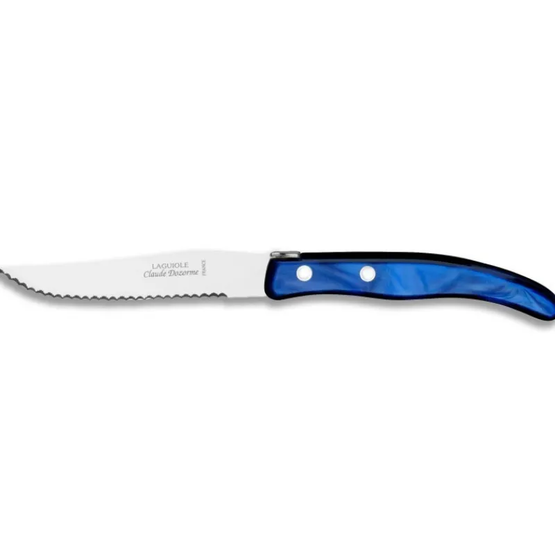 Dans la collection Berlingot, voici le couteau à steak Bleu avec manche en nacrine. Conçu pour une utilisation quotidienne, il simplifie la coupe de viande grâce à sa lame à micro-denture. Une création Claude Dozorme.