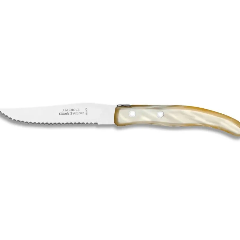 La nacrine de couleur naturelle du couteau à steak Berlingot va assurément trouver sa place sur votre table. Par la coutellerie française Claude Dozorme.