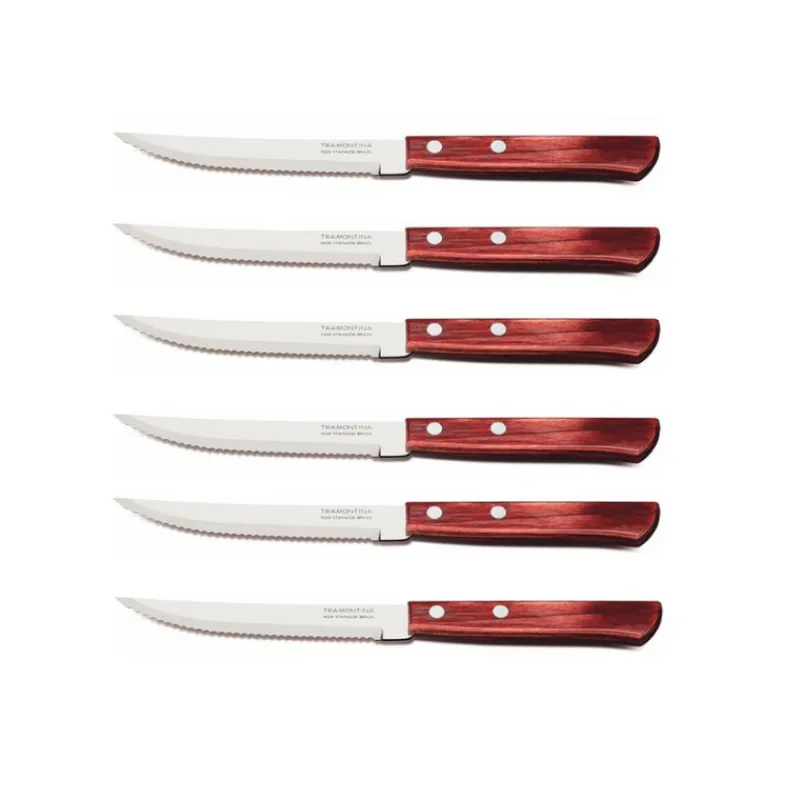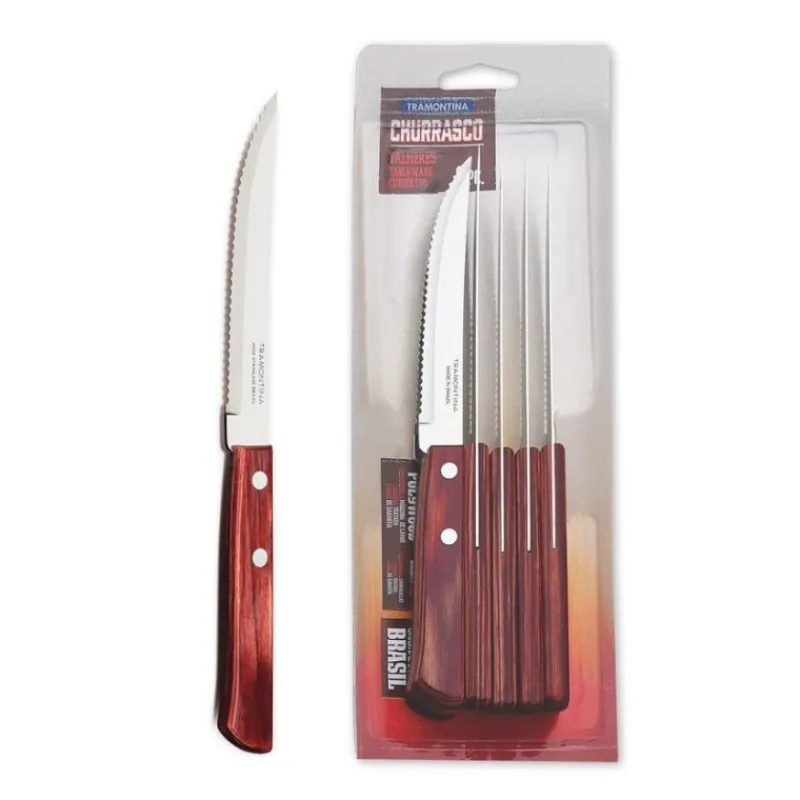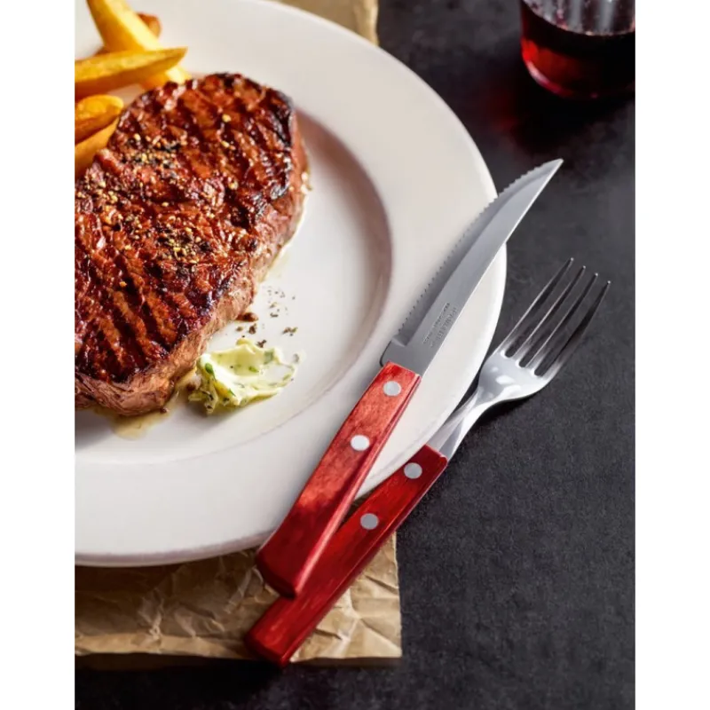 Au Brésil où est née la marque Tramontina, le barbecue est synonyme de tradition, de fête et de convivialité. La marque a donc créé Churrasco, un ensemble de couteaux à steak et pizza au manche rouge en bois riveté.