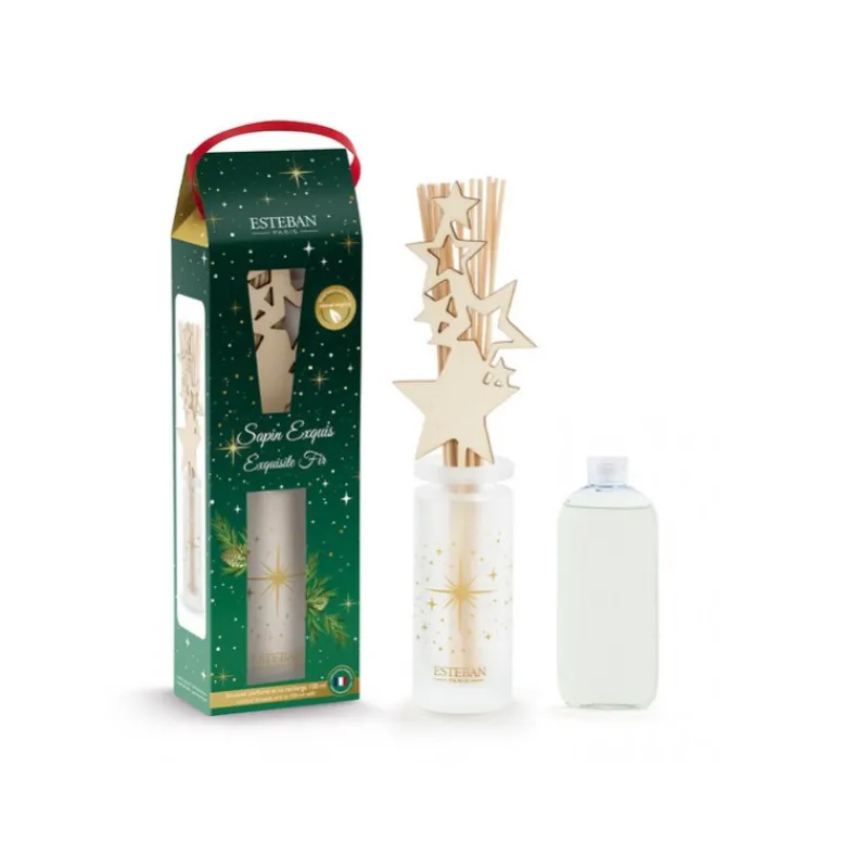 Retrouvez tout le savoir-faire du parfumeur Estéban Paris dans cette très belle édition de Noël : Sapin Exquis. Grâce au bouquet parfumé, vous distillerez un parfum qui participera à créer dans votre intérieur une ambiance festive. Vous apprécierez également son très bel emballage qui en fait un cadeau élégant à offrir.