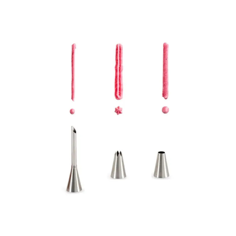 Ce set des plus pratiques comprend également 3 douilles en acier inoxydable de taille standard pour tous les usages. Vous pourrez ainsi décorer vos tartes, garnir vos choux et profiteroles et dresser parfaitement la pâte à cupcakes dans les moules. Ces douilles sont équipées d’un adaptateur fileté, ce qui vous permet de les fixer solidement et sans risque de fuites. De plus, vous pouvez changer de douille avec une poche à douille pleine, ce qui vous permet de passer du garnissage de profiteroles à la décoration de gâteaux en un rien de temps !