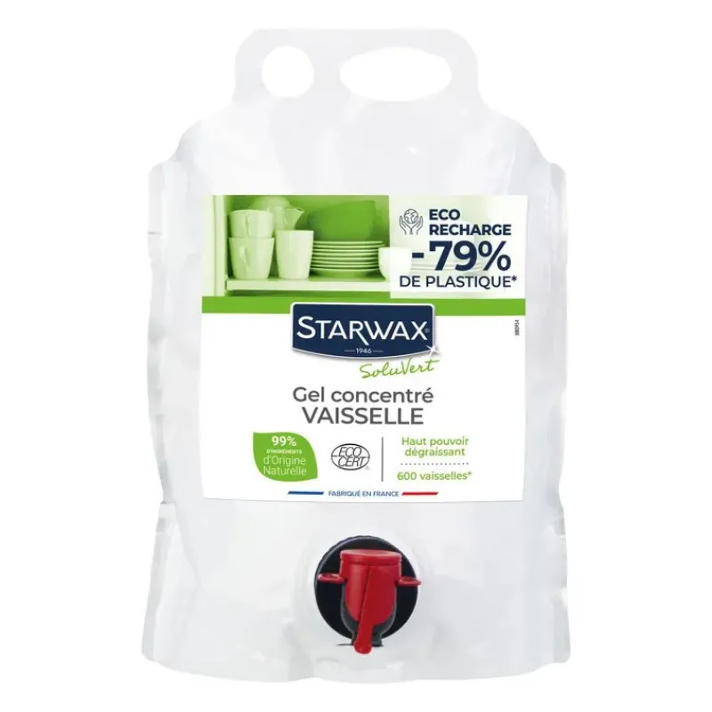 Le gel concentré vaisselle Soluvert de Starwax décolle facilement les salissures et dégraisse en profondeur la vaisselle. Sa mousse généreuse se rinçe facilement et ne laisse aucune trace. Son parfum frais est idéal pour le nettoyage de la vaisselle.