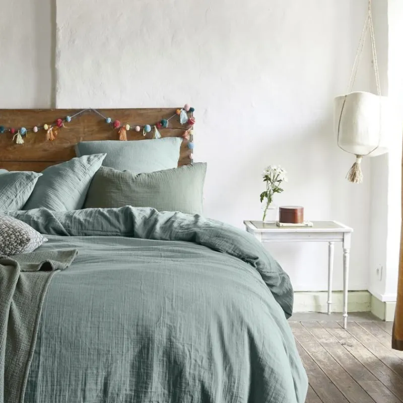 La couleur Céladon de cette housse vous permet de l’assortir avec plusieurs taies d’oreiller ou plusieurs draps. Vous pouvez parfaitement avoir une parure de lit accordée, avec la taie d’oreiller de la même collection. Pour créer une ambiance plus unique, vous pouvez également mettre un drap et une taie d’oreiller dans une autre couleur neutre, qui s’accorde au Céladon.