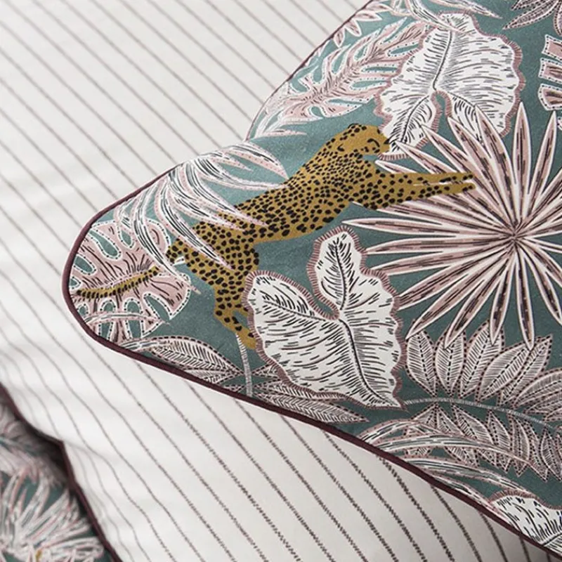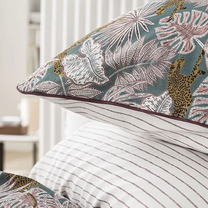 La couleur bleue de fond fait ressortir les motifs de la taie d’oreiller, en représentant un univers naturel et exotique, avec de la végétation et des félins. Cette taie d’oreiller peut être réversible, si vous souhaitez passer une nuit un peu différente, avec un dos plus simple, avec uniquement de fines rayures, sur un fond blanc.