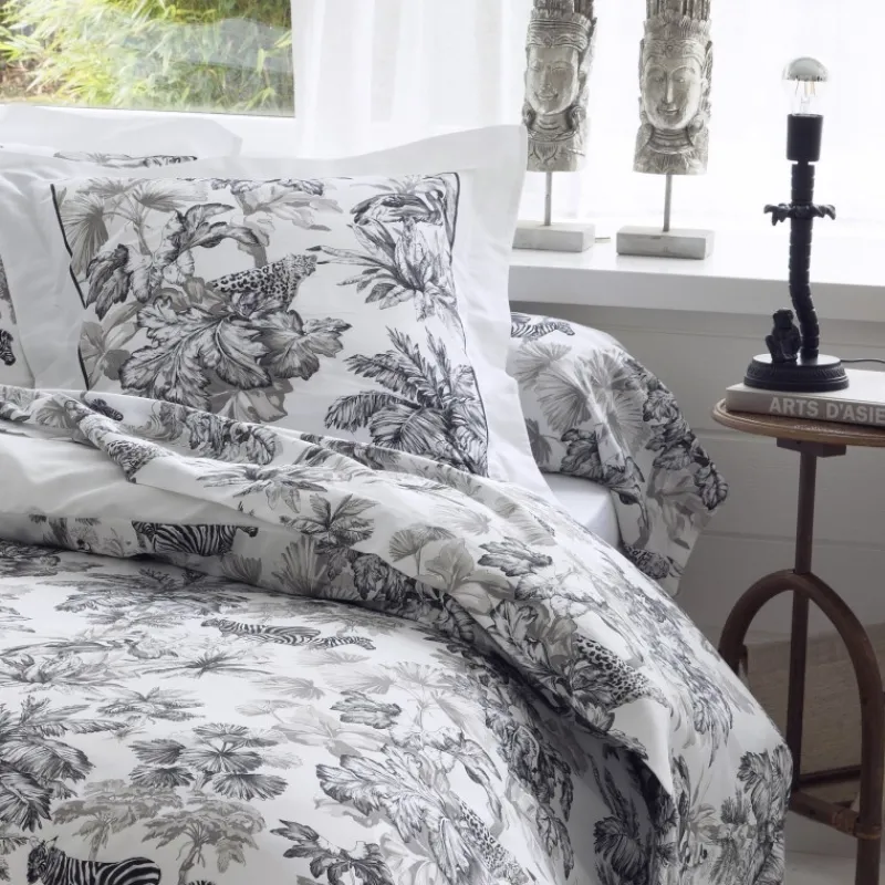 Ultra chic et totalement dans la tendance actuelle, les motifs noirs de cet ensemble de lit sont dessinés à la plume et à l’encre de chine sur un fond blanc en satin de coton, tout en subtilité.