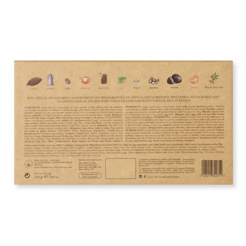 Composition du sachet : Chocolat Noir Menthe, Noir Earl Grey, Noir Orange, Lait Café, Lait Coco, Lait Nougat, Blanc Café, Blanc Thé Matcha, Lait Caramel, Noir 77%, Noir.