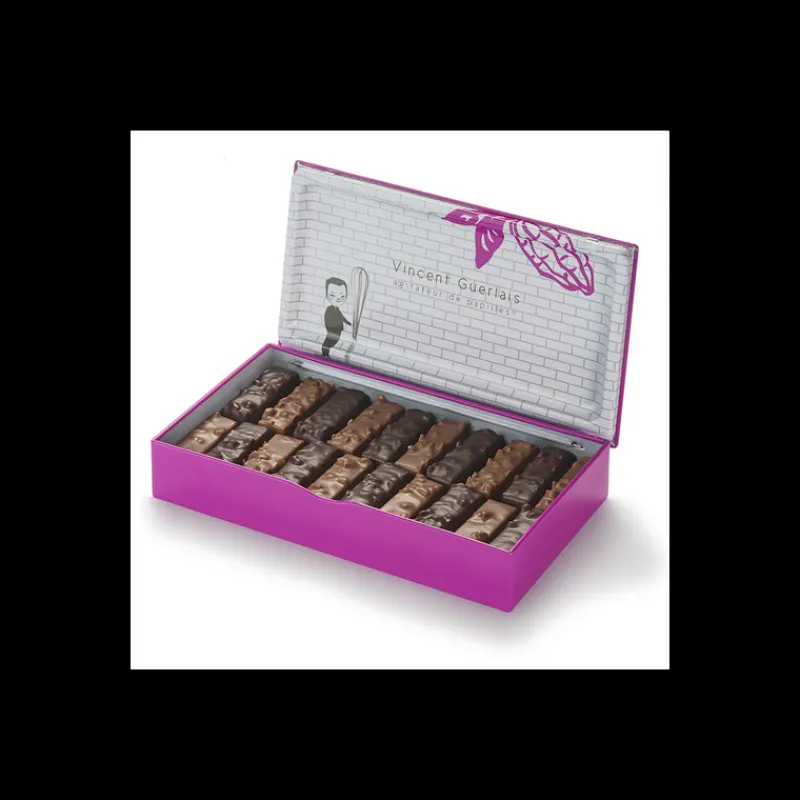 À déguster sur le pouce ou à offrir dans son élégante boite en métal fuchsia, le Finger est devenu une spécialité emblématique de la Maison Guerlais. Sous sa délicieuse coque en chocolat noir ou lait se cachent un gianduja intense à la noisette allié à un caramel onctueux à la fleur de sel : 2 recettes extrêmement gourmandes réunies en une seule bouchée pour le plus grand bonheur de vos papilles !