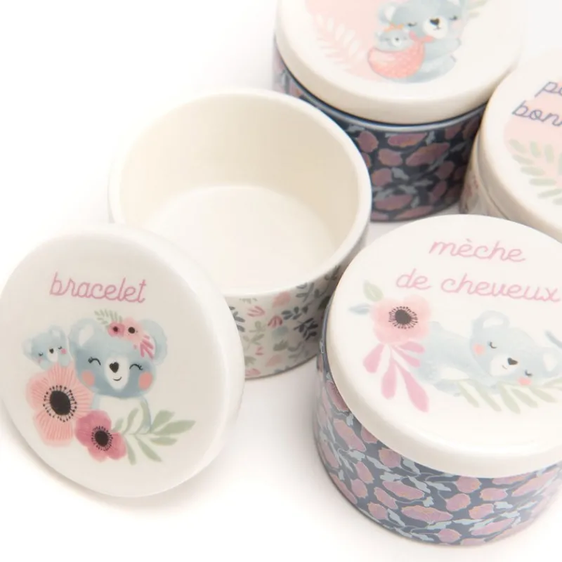 Le bracelet de la maternité, la première dent, le porte-bonheur comme le bola de grossesse ou encore la première mèche de cheveux trouveront un écrin digne du tout-petit. Avec quatre jolies boîtes indispensables à tous les nouveaux parents, ce coffret est parfait pour tous les souvenirs importants.