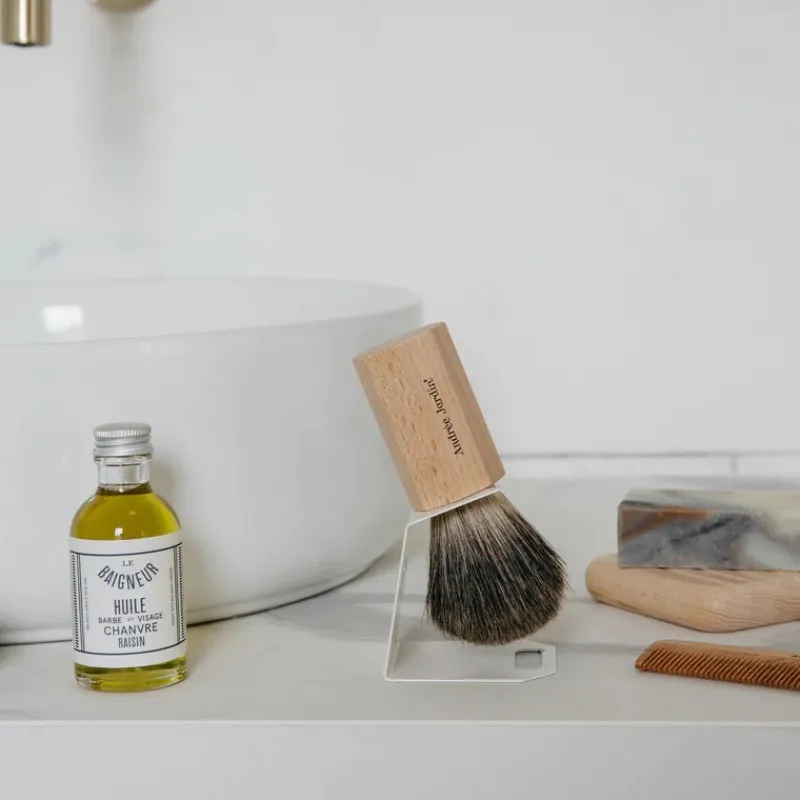 Après utilisation, rincez et essorez délicatement le blaireau. Laissez le sécher à l’air libre, tête vers le bas, sur son support.