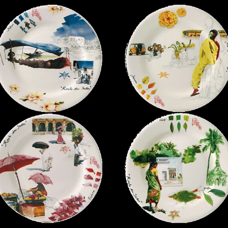 Retrouvez tout le savoir-faire de la Faïencerie de Gien au travers de ces 4 assiettes dessert en faïence fine de la collection Route des Indes. Chaque assiette possède un thème couleur et représente une scène typique de la vie en Inde. On est tout simplement subjugué par le travail des artisans faïenciers.