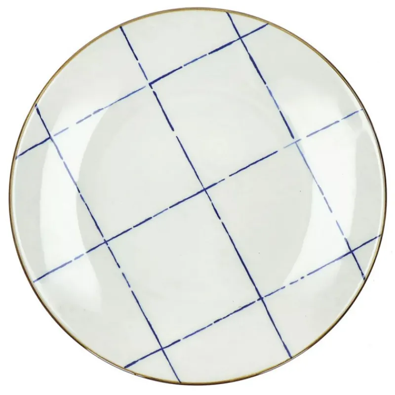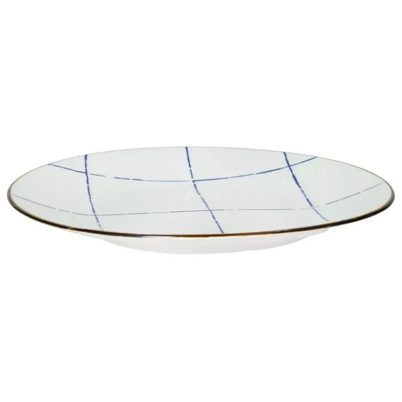 Son motif quadrillé de bleu prend tout son éclat sur la porcelaine blanche brillante. Et vos mets les plus gourmands y révèleront toutes leurs couleurs et leurs saveurs. Bordée d’un liseré caramel, l’assiette plate Anafi est idéale pour embellir un service en porcelaine blanche. Choisissez une nappe caramel ou un chemin de table en lin et vos convives seront ravis de cette table aux accents de bord de mer.