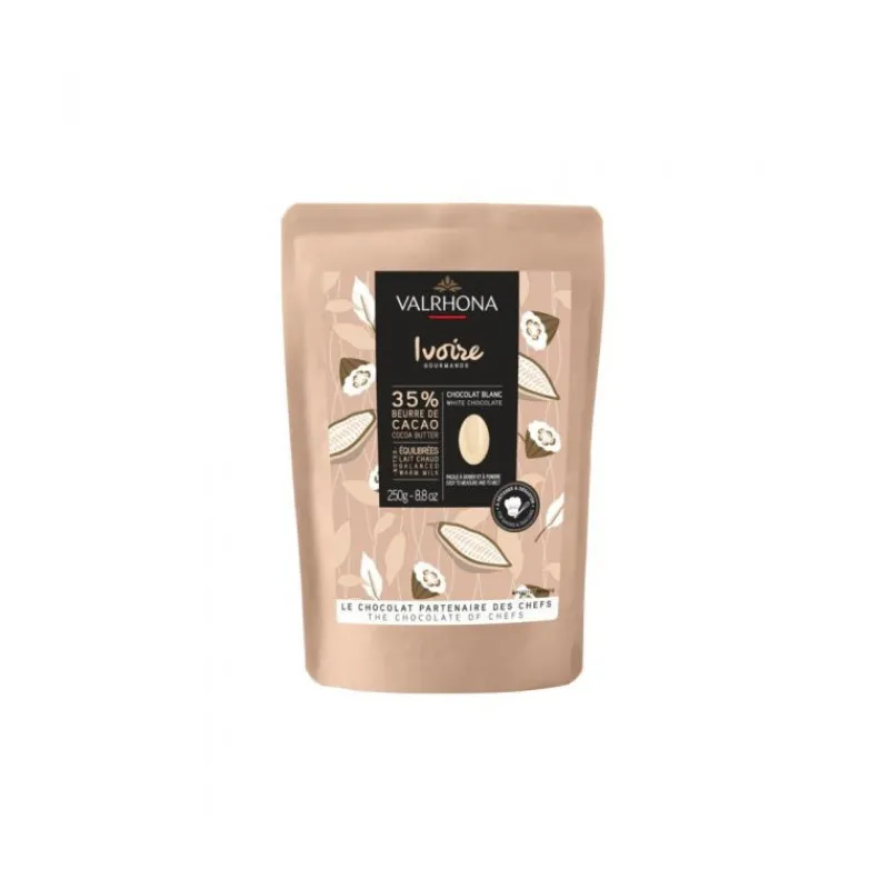Le chocolat de couverture blanc ivoire (35% de beurre de cacao minimum) de Valrhona est le chocolat blanc historique de la marque!