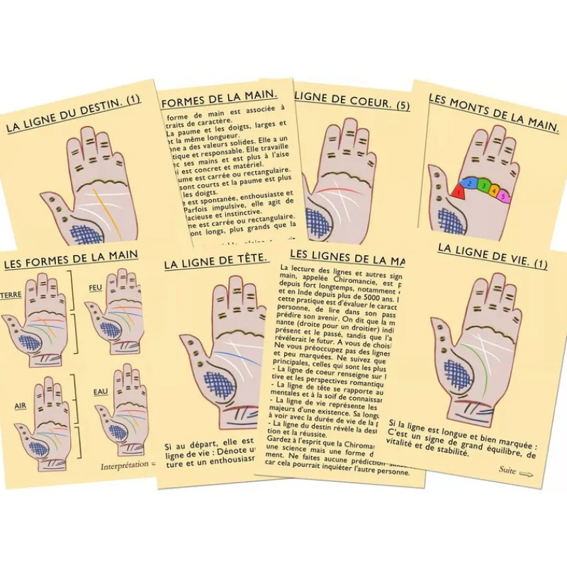 Grâce à 18 cartes illustrées, amusez-vous à lire les lignes de Cœur, de Vie, de Tête et du Destin … Et découvrez à quels aspects de la personnalité elles se rattachent !! Retrouvez les explications sous chaque illustration, ces cartes sont idéales pour une soirée consacrée au arts divinatoires.