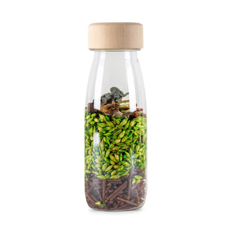 Laissez votre enfant découvrir le monde mystérieux et sauvage de la jungle, en retournant la Bouteille Sensorielle Spy de Petit Boum.