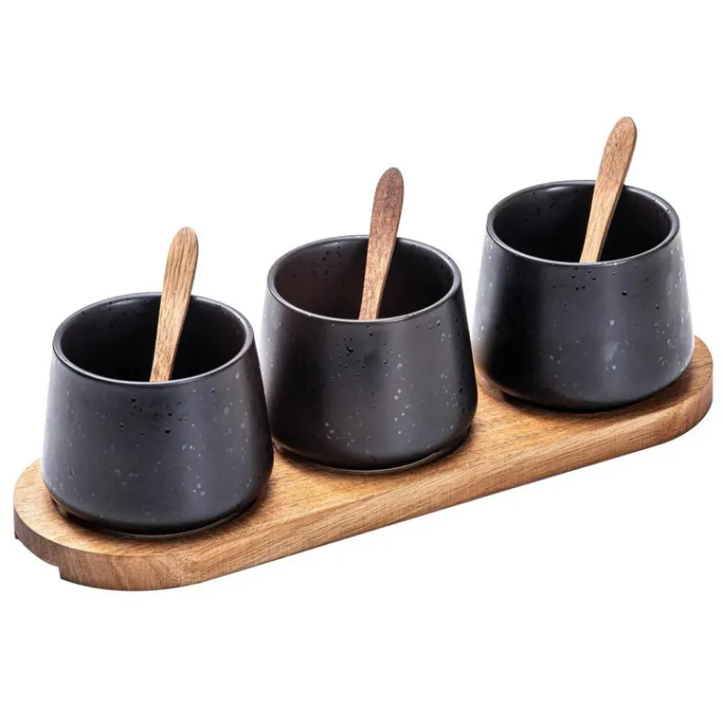L’ensemble Onyx Elements est parfait pour la présentation des sauces, des condiments, des apéritifs…Posées sur un joli plateau en acacia, les coupelles en grès coloris Onys sont complétées de 3 cuillères pour le service.