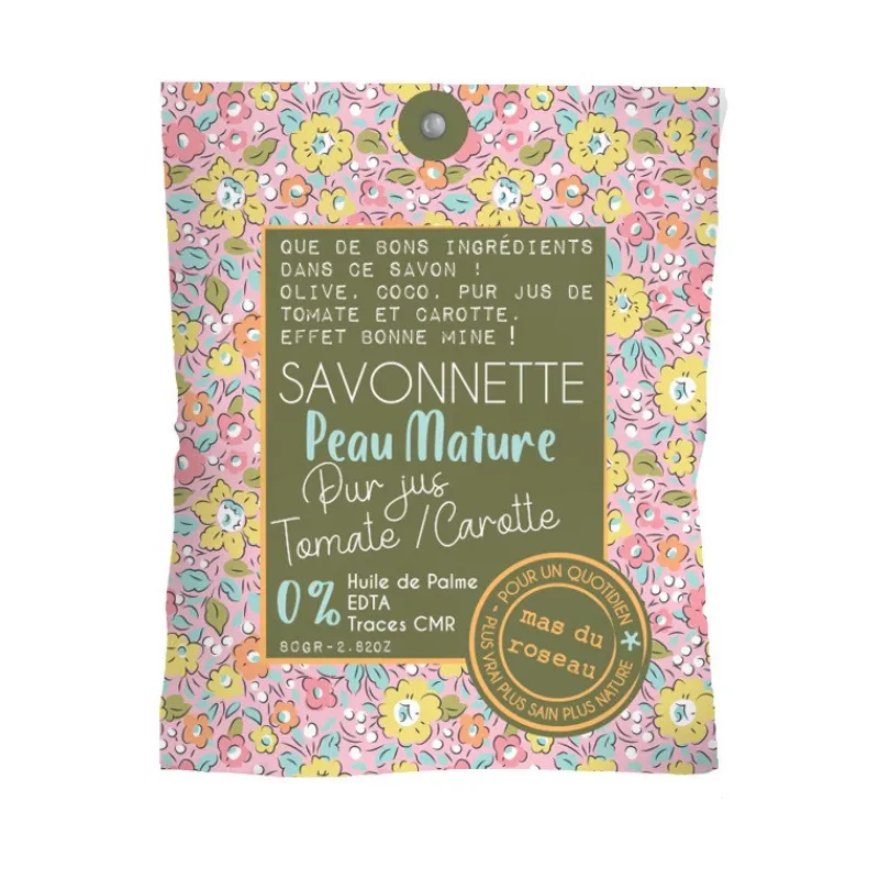 Mas du roseau propose ici un excellent savon pour les peaux matures grâce à une formulation à base d’huile d’olive, d’huile de coco de jus de tomate et de jus de carotte.