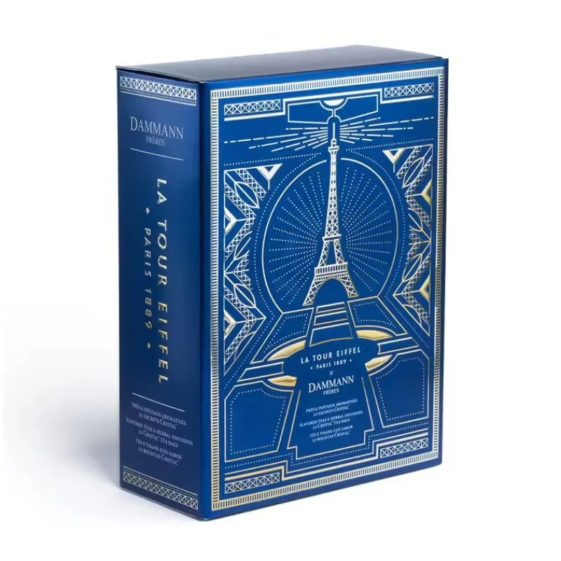 Présenté dans un coffret bleu nuit avec pour décor, la Tour Eiffel étincelante d’or qui se dresse rayonnante devant la perspective stylisée du Champ-de-Mars, un assortiment de 20 sachets Cristal® composé d’un thé classique, de trois thés aromatisés et d’une infusion :