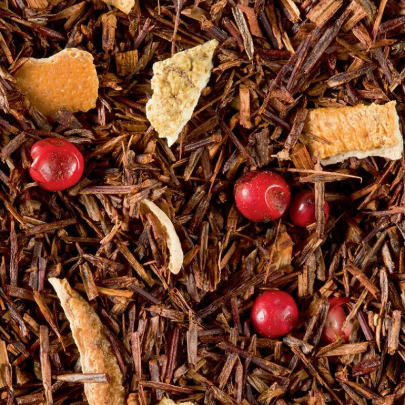 - Ingrédients : Rooibos, épices (baies roses, clous de girofle, morceaux de gingembre), écorces d’oranges, arômes (pain d’épices, orange amère, cerise).
