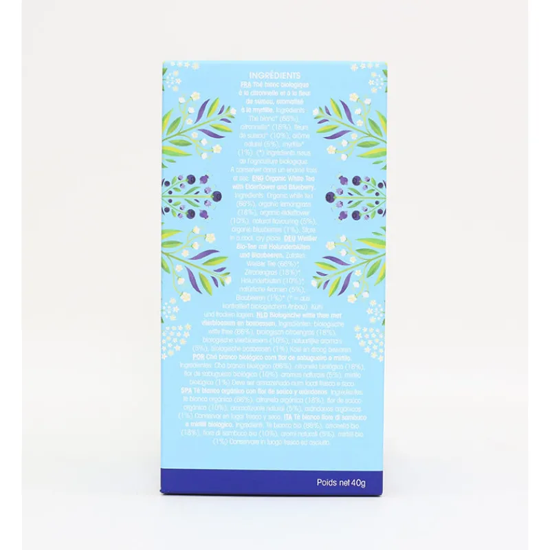 Ingrédients : thé blanc* (48.5%), citronnelle* (18%), fleurs de sureau* (10%), feuilles de murier* (8%), réglisse* (8%), arôme naturel de myrtille* (7%), myrtille* (0.5%). Contient de la réglisse. (*) Ingrédients issus de l’agriculture biologique.