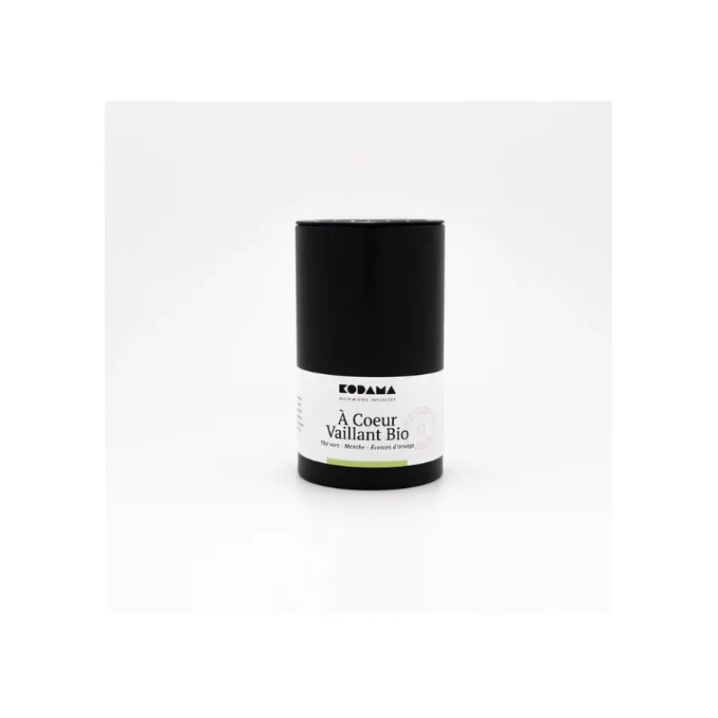 Thé vert, Menthe, Écorces d’orange, Eucalyptus, voilà le mélange prometteur de la création À coeur vaillant bio de Kodama.