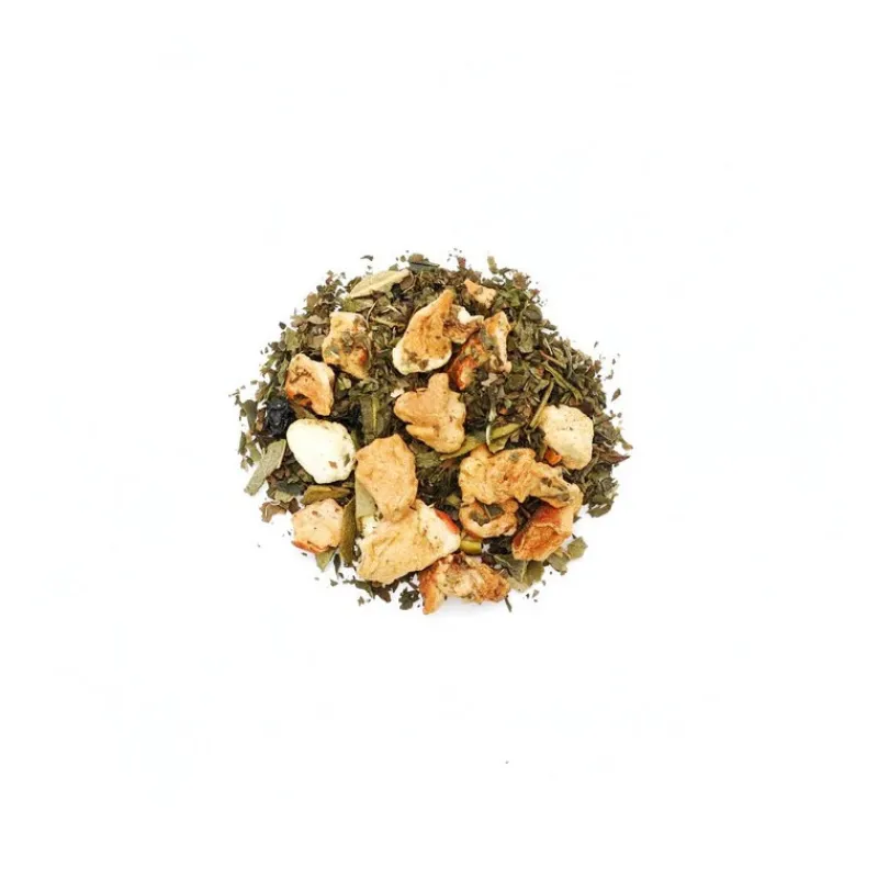 - Ingrédients : Pommes*, thé vert sencha*, menthe*, écorces d’orange*, eucalyptus*, baies de sureau*, arôme naturel (orange)