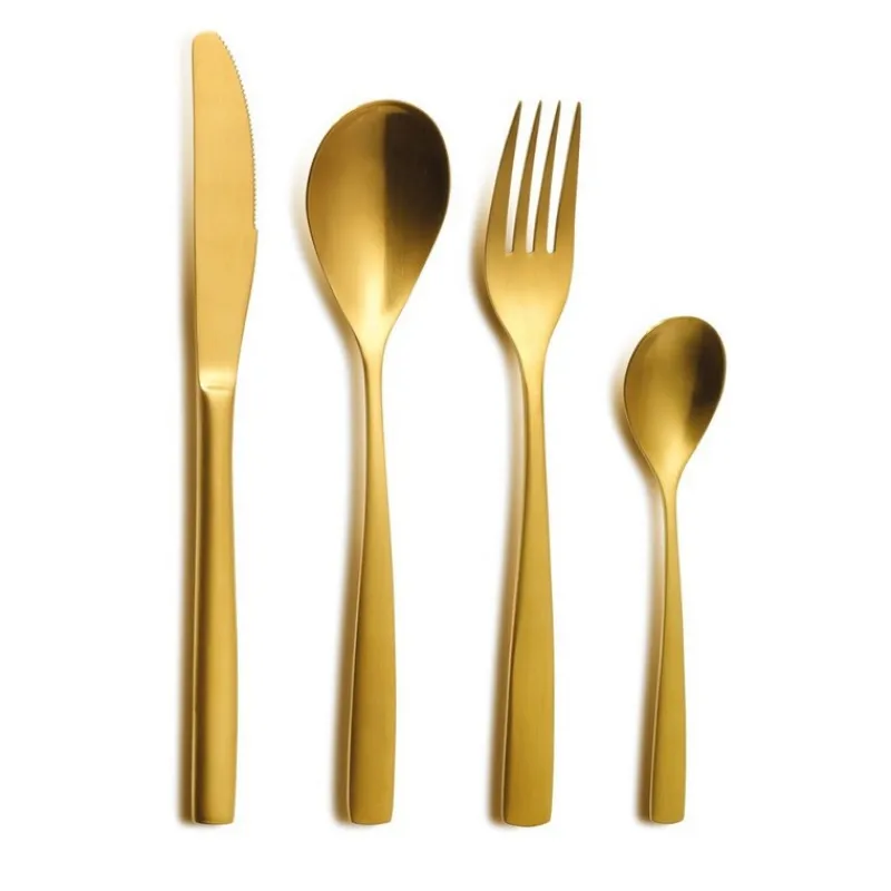 La ménagère Barcelona Or est fabriquée en acier inoxydable 18/0 : un inox composé à 18% de chrome apportant une bonne résistance à la corrosion et aux chocs. Ils disposent d’un revêtement PVD dont l’avantage est d’obtenir des pièces plus brillantes et plus résistances ! Ce traitement permet également de maintenir cette finition Or dans le temps. La finition est satinée, les couverts ont donc un léger effet brillant et sont très agréables au toucher.