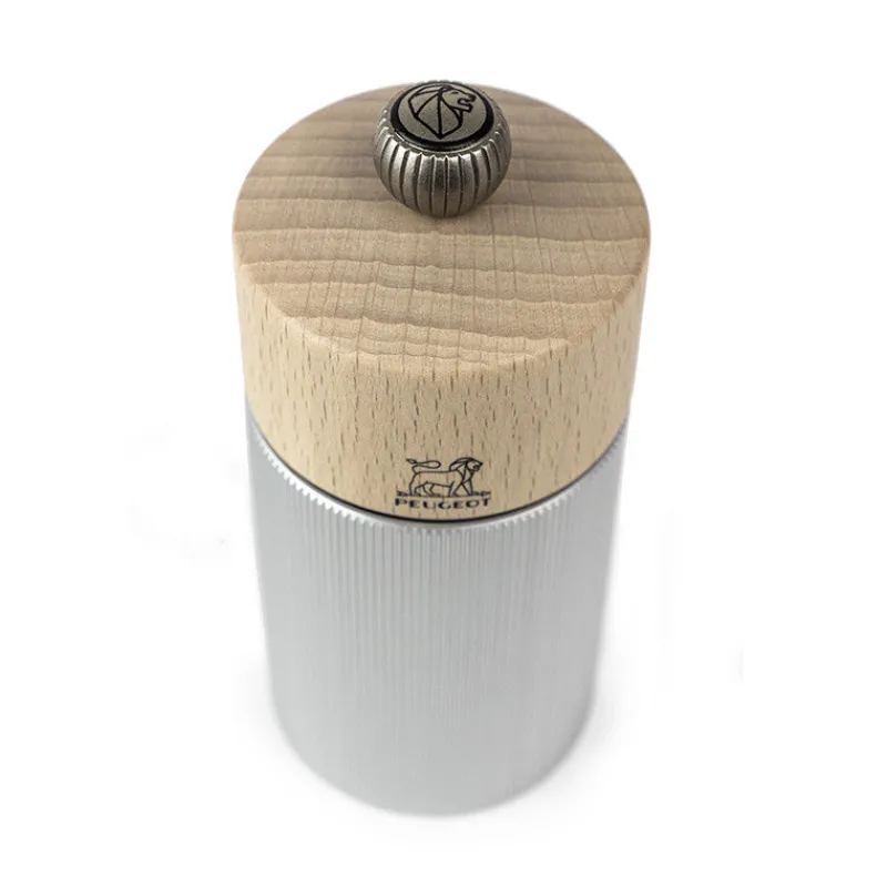 Une tête en bois naturel et un corps en aluminium strié sont les matériaux sélectionnés pour ce magnifique moulin à poivre Line Aluminium de Peugeot.