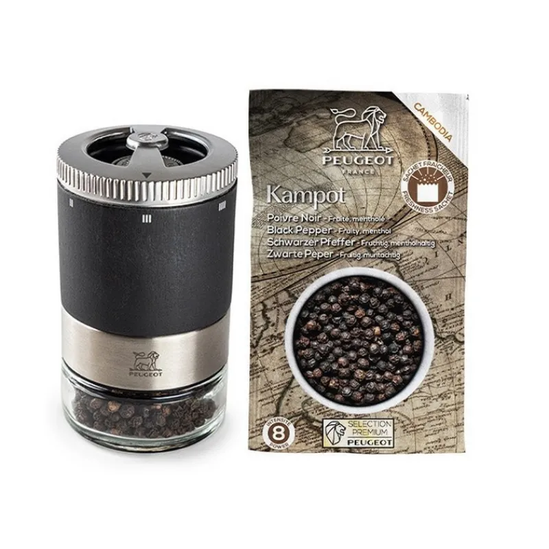 Cet accessoire est vendu avec un sachet de poivre noir de Kampot de 20g. Ce sachet hermétique va vous permettre de tester ce moulin avec un poivre aux arômes fruités et mentholés.