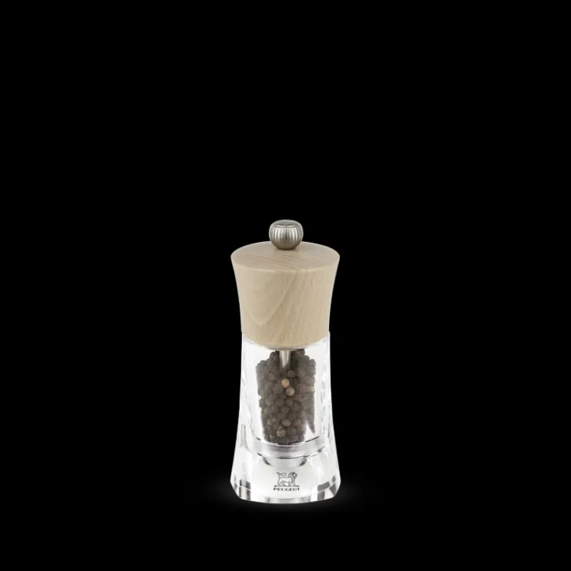 Moulin Oléron manuel en bois naturel et acryl de Peugeot, un éveil des sens tout en transparence associé à une tête en bois a été étudié pour moudre facilement et durablement les poivres les plus prestigieux.