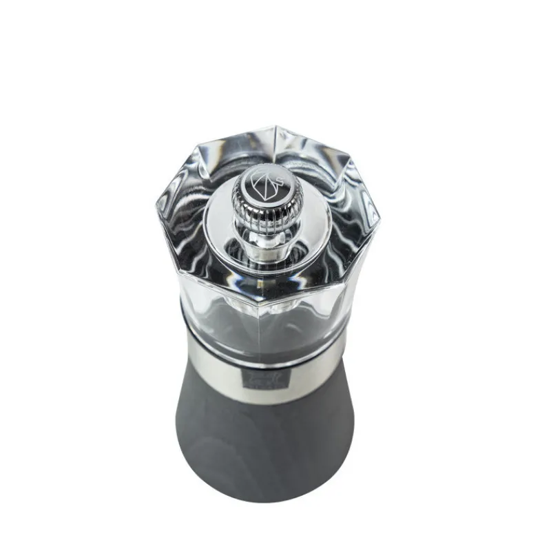 Les reflets métallisés de son corps en bois rappellent le métal de sa bague inox et jouent subtilement avec l’éclat et la transparence de la tête du moulin. Ce moulin manuel est équipé d’un mécanisme à sel en acier, garanti sans limitation de durée. Il a été conçu pour moudre le sel sec (sel gemme). Son petit plus, un bouton en métal brillant qui permet de régler la taille de la mouture. Ainsi, plus le bouton est serré, plus la mouture est fine et inversement pour une mouture plus grossière. Son design sobre et contemporain plaira aux amateurs de style traditionnel ou plus moderne; il embellira votre table de sa jolie transparence et de ses facettes reflétant doucement la lumière. Gastronomes exigeants, néophytes ou gourmets, vous allez être conquis!