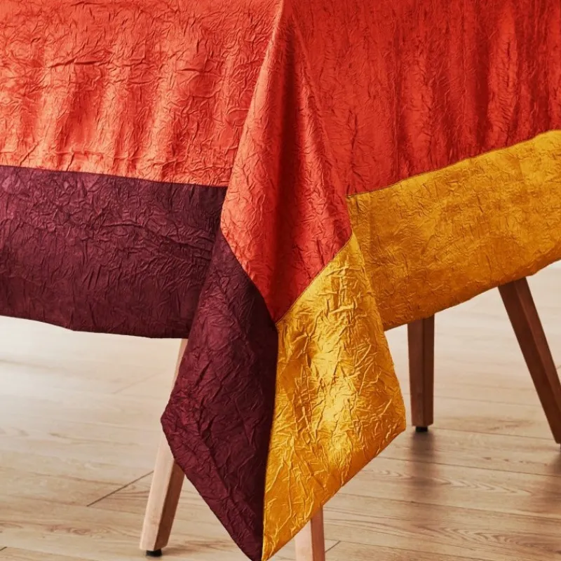 Craquez pour l’élégance de cette nappe Taffetas froissé Terre cuite unie avec Bordure de José Houel.